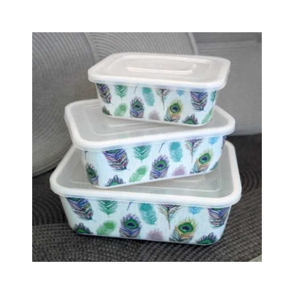 Акцентът на комплекта е красивият принт с шарени паунови пера. Ярките цветове и детайлната декорация придават на кутиите привлекателен и модерен вид, който се отличава от обикновените кухненски съдове. Този дизайн ги прави подходящи не само за съхранение вкъщи, но и за пренасяне на храна до офиса, училище или по време на пикник.