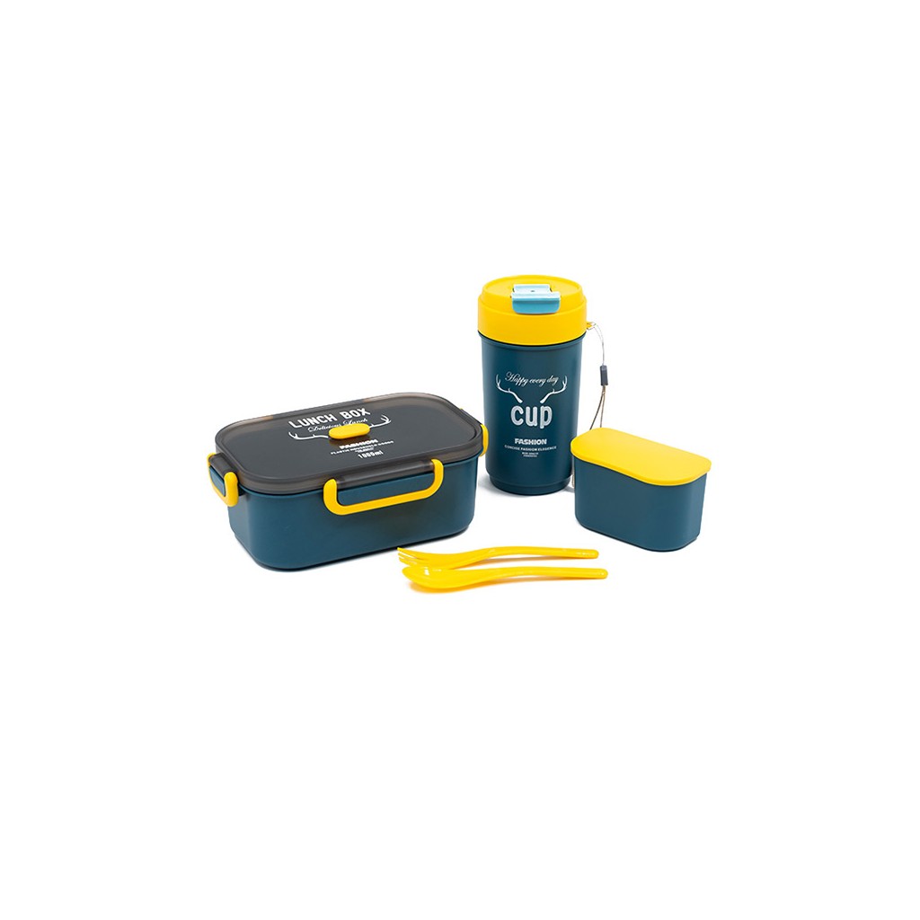 Комплектът включва всичко необходимо за комфортно хранене извън дома – основен контейнер, допълнителен малък съд, чаша и прибори. Благодарение на добре проектирания механизъм за затваряне, капакът прилепва плътно и създава сигурно уплътнение. Това позволява спокойно пренасяне на супи, салати, плодове, сандвичи и други ястия без притеснение от течове. Формата е ергономична и удобна за хващане, а компактните размери улесняват поставянето в раница, чанта или автомобилен органайзер.