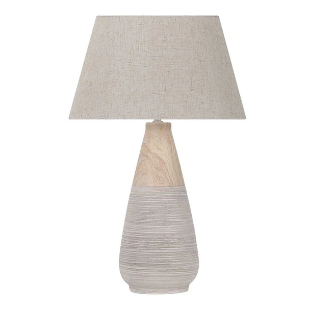 Лампата е с керамична основа и текстилен абажур в бежов цвят.