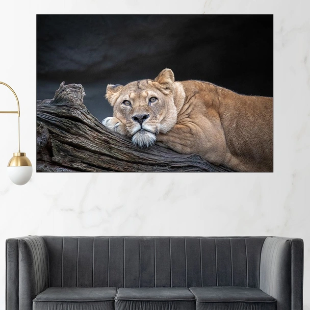 Декорация за стена (картина, пано) с мотив "Легнала върху дърво лъвица - картина пано за стена". Изработена от олекотено PVC с дебелина 5 мм или канава от 100% памук, опъната върху дървена подрамка с дебелина 5 см. Изображението се печата с висококачествен UV печат, което е гаранция за запазване на цветовете с години!
