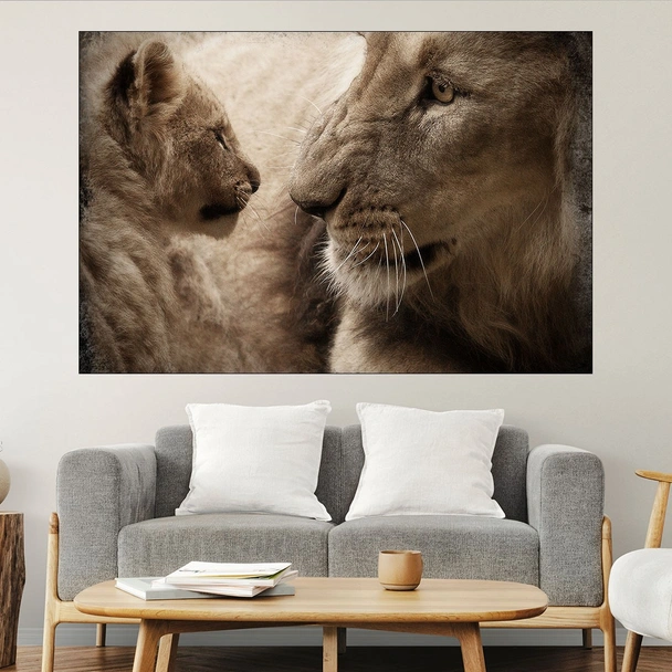 Декорация за стена (картина, пано) с мотив "Лъв със своето бебе - картина пано за стена". Изработена от олекотено PVC с дебелина 5 мм или канава от 100% памук, опъната върху дървена подрамка с дебелина 5 см. Изображението се печата с висококачествен UV печат, което е гаранция за запазване на цветовете с години!