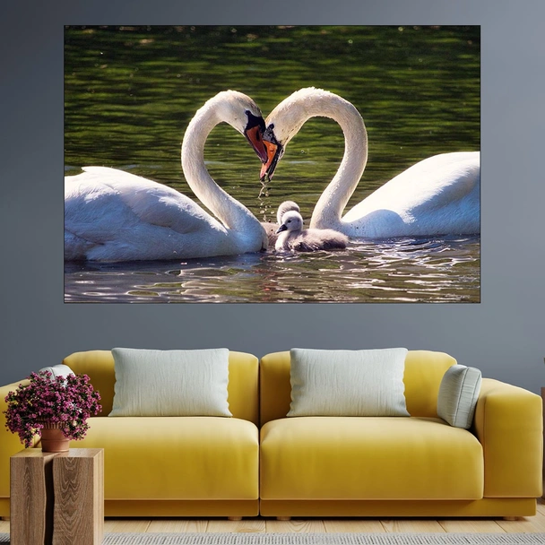 Декорация за стена (картина, пано) с мотив "Лебедово семейство - картина пано за стена". Изработена от олекотено PVC с дебелина 5 мм или канава от 100% памук, опъната върху дървена подрамка с дебелина 5 см. Изображението се печата с висококачествен UV печат, което е гаранция за запазване на цветовете с години!