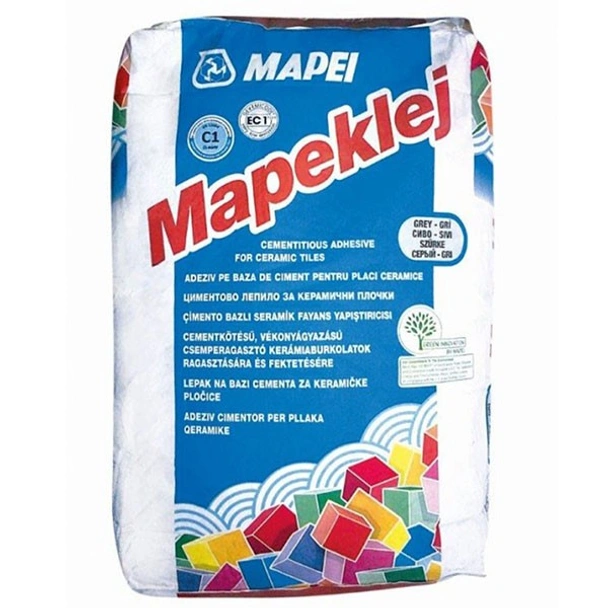 Лепило на циментова основа Mapeklej на марката MAPEI в сив цвят, подходящo за лепене на керамични плочки и мозайка, фаянс и теракот по подове, стени и тавани във вътрешни помещения и на открито.