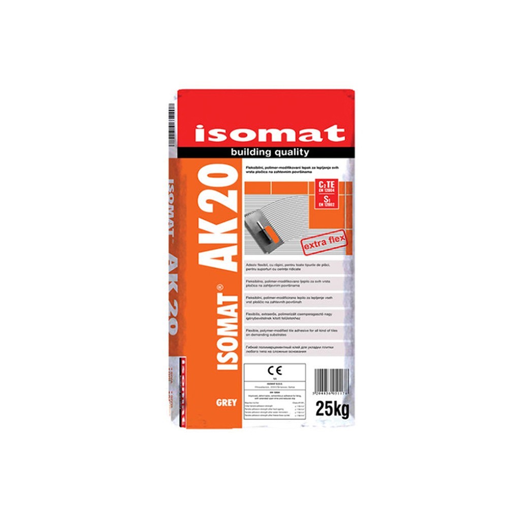 Еластично полимер-циментово лепило за плочки AK-20 ISOMAT в сив цвят, предназначено за лепене на абсорбиращи и неабсорбиращи плочки (като "grès porcellanato"), естествени камъни, декоративни тухли, плочки с големи размери и др. върху стени и подове.