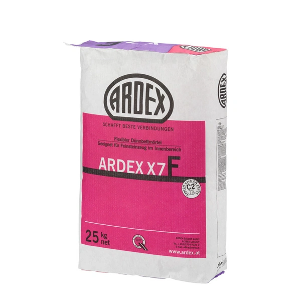 ARDURIT X 7 G е произведено с основа цимент. То е водоустойчиво, студоустойчиво и еластично лепило. Предназначено е за залепване на фаянс и теракот, гранитогрес, естествени камъни и изолационни строителни материали