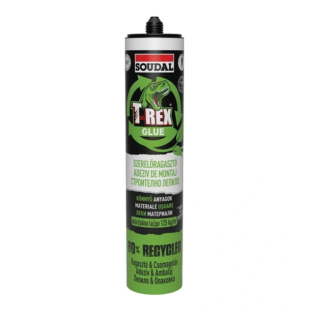 Soudal T-REX Green е иновативно строително лепило, разработено с фокус върху устойчивостта и опазването на околната среда. Продуктът е произведен от рециклирани и биологични суровини, като запазва всички качества на високоефективно монтажно лепило. Черната опаковка и накрайникът са съставени от 80% рециклируеми материали, което прави продукта отличен избор за „зелено“ строителство. Лепилото е на водна основа, осигурява много здраво залепване на леки материали и е специално оптимизирано за работа върху порести и дишащи повърхности.
