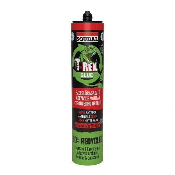 Soudal T-REX Green е иновативно строително лепило, създадено с фокус върху опазването на околната среда, без компромис с качеството и здравината. То е произведено от рециклирани суровини, като черната опаковка и накрайникът му са 80% рециклируеми. Лепилото е на водна основа и се отличава с изключително висока начална якост от 250 кг/м2, което го прави идеално за вертикално залепване на тежки материали. Формулата е проектирана да осигурява надеждна връзка, като същевременно е безопасна за работа и не съдържа агресивни разтворители.