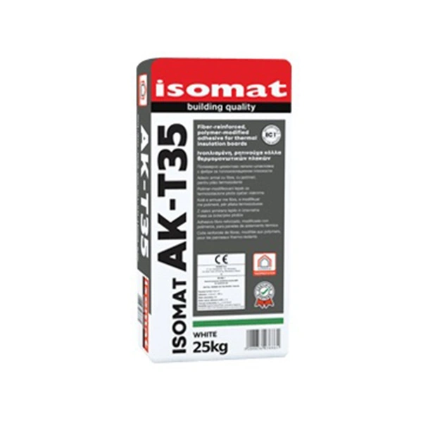 ISOMAT AK-T35 е високачествен полимер-циментов разтвор в бял цвят, специално разработен за изграждане на устойчиви топлоизолационни системи. Продуктът изпълнява две основни функции: служи като надеждно лепило за фиксиране на изолационни плоскости от полистирен (EPS) и като армираща шпакловка. Благодарение на белия си цвят, той осигурява отлична основа за финални мазилки, особено при светли цветове, като предотвратява прозирането на сивата основа.