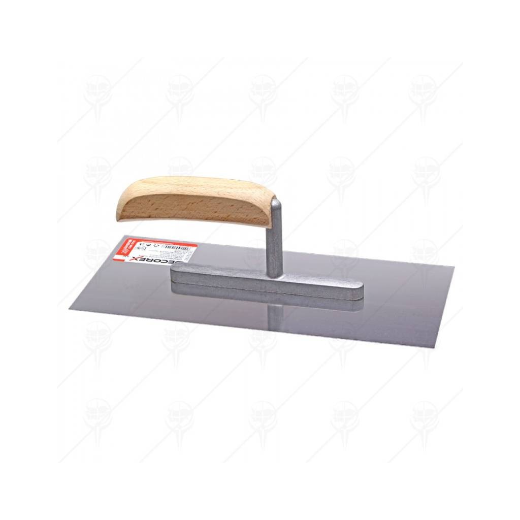 Маламашка с гладка повърхност на фирма DECOREX, произведена от неръждаема стомана и с отворена дървена дръжка. Маламашката е с дължина 270 мм и ширина 130 мм. Ръчен инструмент, с които се заглаждат обработени със строителни разтвори различни повърхности.