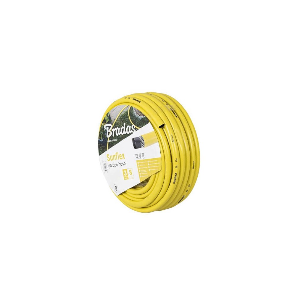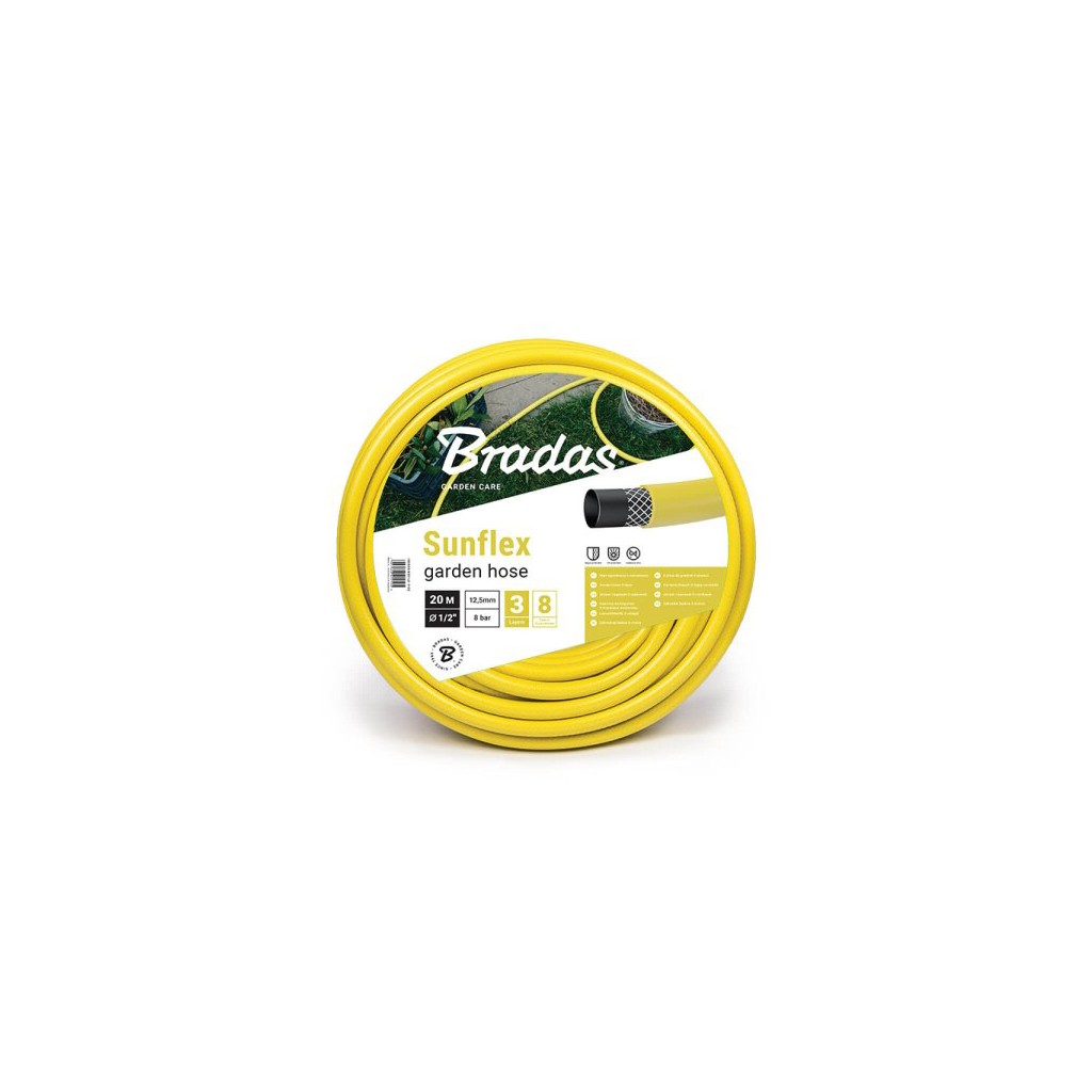 Градински подсилен трислоен маркуч Sunflex на марката BRADAS с дължина 20 метра и диаметър 1/2" (12.5 мм).