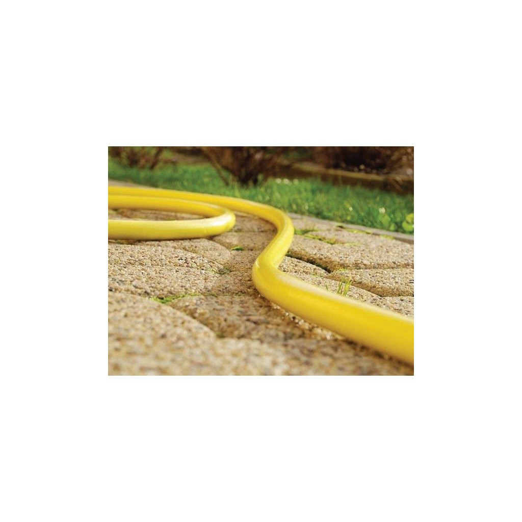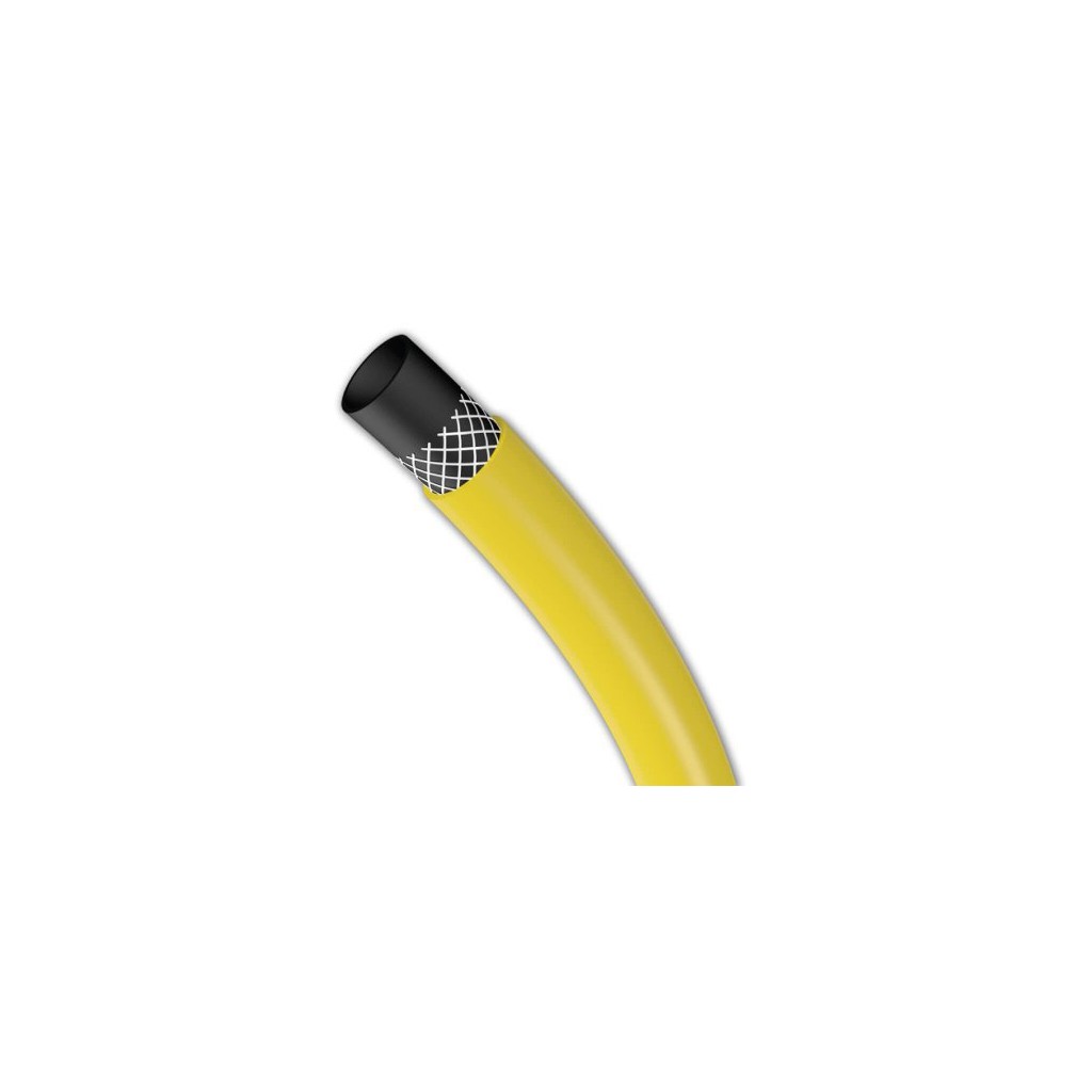 Вторият слой е оплетен със синтетични влакна, а външният слой е от изработен от гъвкав PVC материал в жълт цвят.