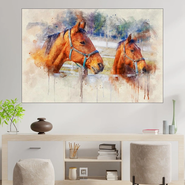 Декорация за стена (картина, пано) с мотив "Акварел - Коне - картина пано за стена". Изработена от олекотено PVC с дебелина 5 мм или канава от 100% памук, опъната върху дървена подрамка с дебелина 5 см. Изображението се печата с висококачествен UV печат, което е гаранция за запазване на цветовете с години!