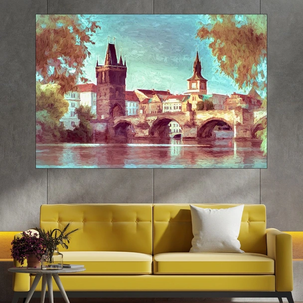 Декорация за стена (картина, пано) с мотив "Картина на мост в Прага - картина пано за стена". Изработена от олекотено PVC с дебелина 5 мм или канава от 100% памук, опъната върху дървена подрамка с дебелина 5 см. Изображението се печата с висококачествен UV печат, което е гаранция за запазване на цветовете с години!