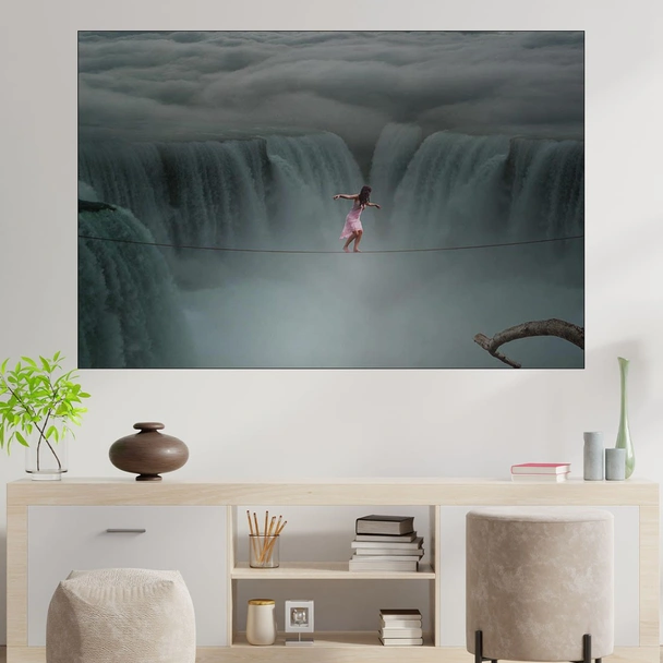 Декорация за стена (картина, пано) с мотив "Момиче на въже над водопади - картина пано за стена". Изработена от олекотено PVC с дебелина 5 мм или канава от 100% памук, опъната върху дървена подрамка с дебелина 5 см. Изображението се печата с висококачествен UV печат, което е гаранция за запазване на цветовете с години!
