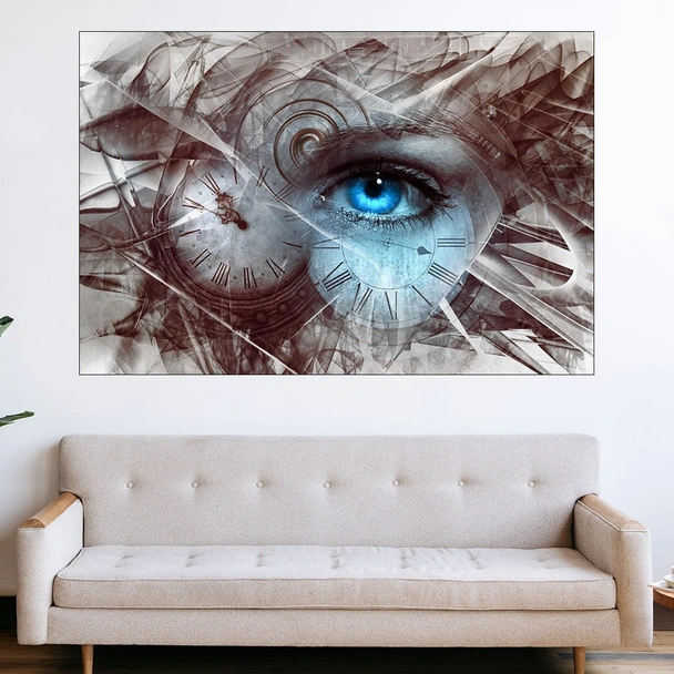 Декорация за стена (картина, пано) с мотив "Окото на времето - картина пано за стена". Изработена от олекотено PVC с дебелина 5 мм или канава от 100% памук, опъната върху дървена подрамка с дебелина 5 см. Изображението се печата с висококачествен UV печат, което е гаранция за запазване на цветовете с години!