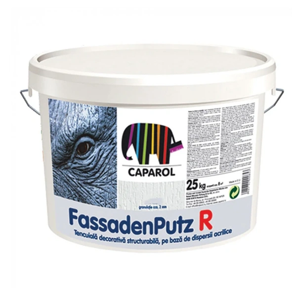 Caparol Fassadenputz е структурна мазилка на базата на акрилни смоли, с R структура -„влачена”, препоръчана за полагане върху екстериорни повърхности. Идеална е като финишен слой при топлоизолационни системи. Не се препоръчва за кредирал иоснови, както и пластмасови или дървени повърхности.