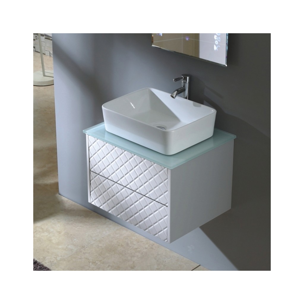 Умивалникът се монтира върху плота на долния шкаф, има отвор за смесител и преливник, не разполага със сифон.