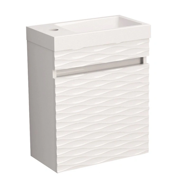 Моделът разполага с достатъчно вътрешно пространство за съхранение на всичките ви тоалетни принадлежности. Той е оборудван с панти със „soft close“ механизъм (DTC), който гарантира плавно и безшумно затваряне. Тази функция не само предотвратява износването на мебела, но и допринася за спокойствието във вашата баня. Шкафът е в комплект с висококачествена мивка, изработена от смола в бял цвят, която е изключително лесна за почистване и поддръжка, осигурявайки безупречна хигиена всеки ден. Компактните размери на шкафа и мивката го правят подходящ дори за най-малките бани, където ефективното използване на пространството е от ключово значение.