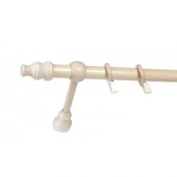 Дървен корниз за завеси в цвят бор, който се предлага с пълен комплект аксесоари за корниз (трегер, халки с кука, накрайници, аксесоари за монтаж) с размери 240 см и диаметър 28 мм.