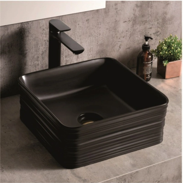 Стилен дизайнерски умивалник с модерна визия, изработен изцяло от порцелан с гладка повърхност в цвят черен мат. Умивалникът е с изчистен и елегантен дизайн, предназначен за монтаж върху плот.
