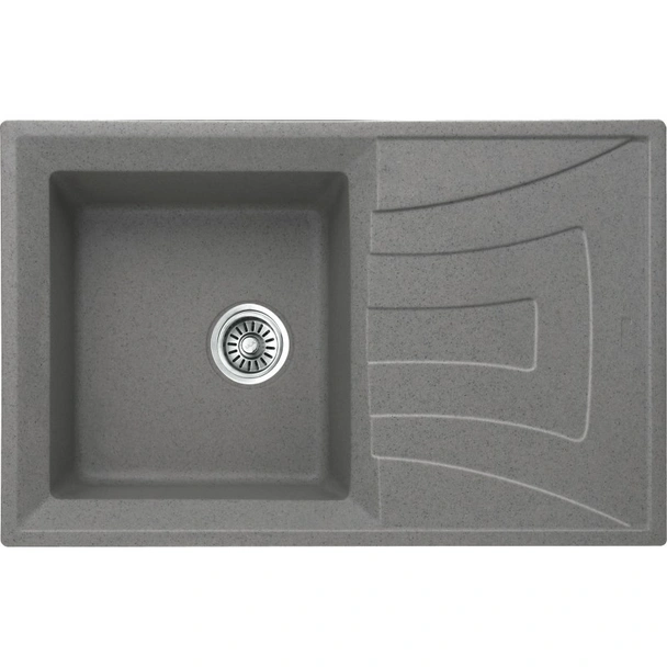 Стилен дизайнерски умивалник с модерна визия, изработен изцяло от гранит в сив цвят. Умивалникът е с изчистен и елегантен дизайн, предназначен за вграждане в кухня. разполага със сифон, с едно корито и един плот.
