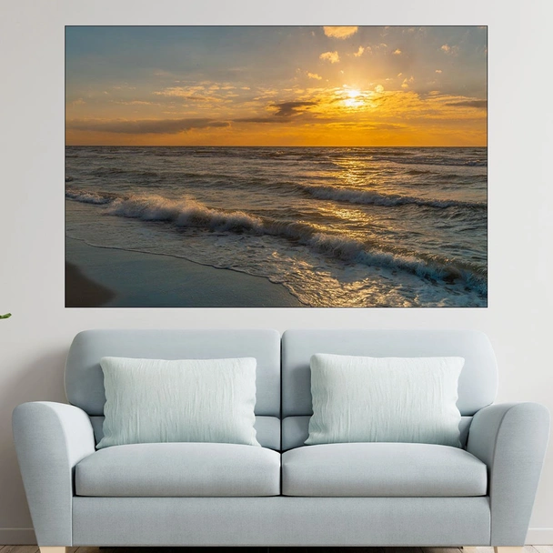 Декорация за стена (картина, пано) с мотив "Красив залез над Балтийско море - картина пано за стена". Изработена от олекотено PVC с дебелина 5 мм или канава от 100% памук, опъната върху дървена подрамка с дебелина 5 см. Изображението се печата с висококачествен UV печат, което е гаранция за запазване на цветовете с години!