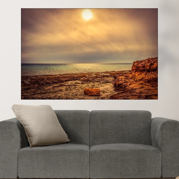 Декорация за стена (картина, пано) с мотив "Облачно време над скалист бряг - картина пано за стена". Изработена от олекотено PVC с дебелина 5 мм или канава от 100% памук, опъната върху дървена подрамка с дебелина 5 см. Изображението се печата с висококачествен UV печат, което е гаранция за запазване на цветовете с години!