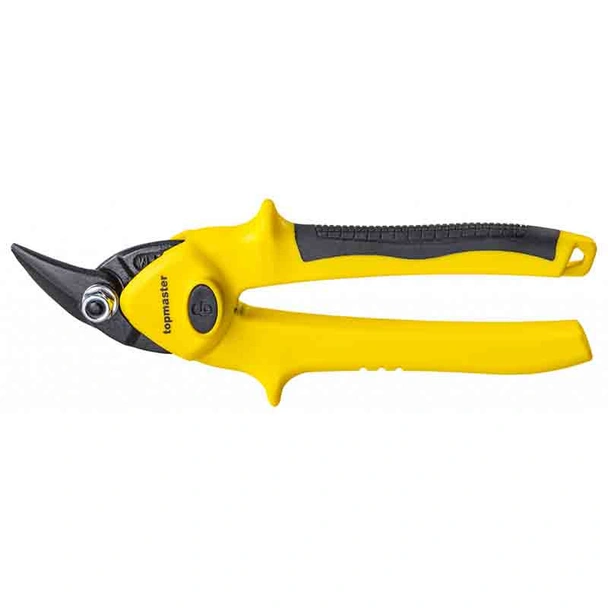 Компактна усилена ножица за ламарина с ляво рязане на марката Topmaster, изработена по патентована технология.