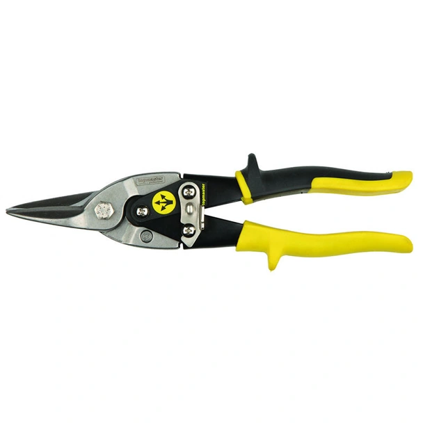Ножица за ламарина с право рязане от 2-ро поколение на марката Topmaster с двукомпонентни ръкохватки, предпазващи от плъзгане и осигуряващи удобство и контрол.