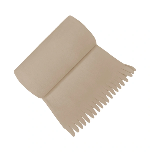 Поларено одеяло с ресни с размери 100x150 сантиметра, изработено от полиестер в бежов цвят.