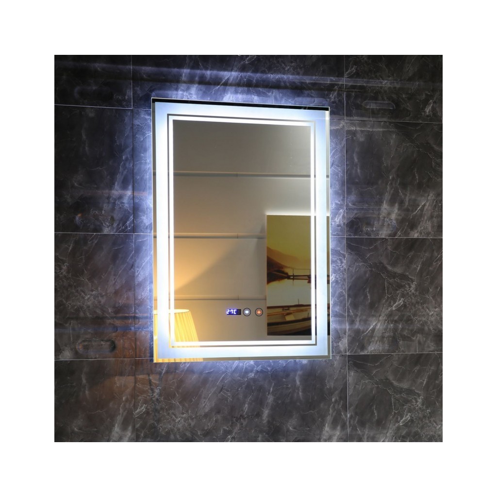 Огледалото ICL 1794 разполага с висококачествено LED осветление с цветна температура от 6500K, което осигурява ярка и неутрална светлина, идеална за прецизни дейности като гримиране или бръснене. Управлението на осветлението е лесно и интуитивно чрез Touch screen бутон. Една от най-ценните функции на този модел е вградената система против замъгляване, която гарантира, че огледалото ще остане кристално чисто дори след горещ душ. Освен това, то е оборудвано с дигитален часовник и индикатор за температура, които ви осигуряват полезна информация в реално време, без да се налага да използвате други устройства.