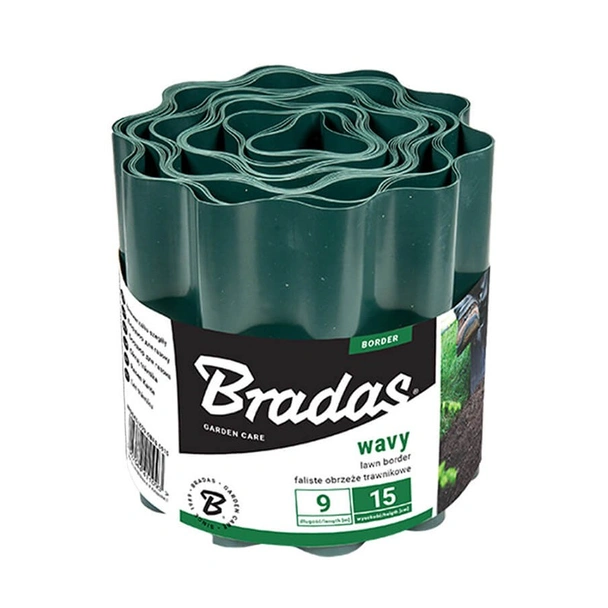 Ограничителна вълнообразна лента на марката BRADAS, предназначена за разделяне на тревата в градината от различните видове цветни лехи, настилки и алеи.
