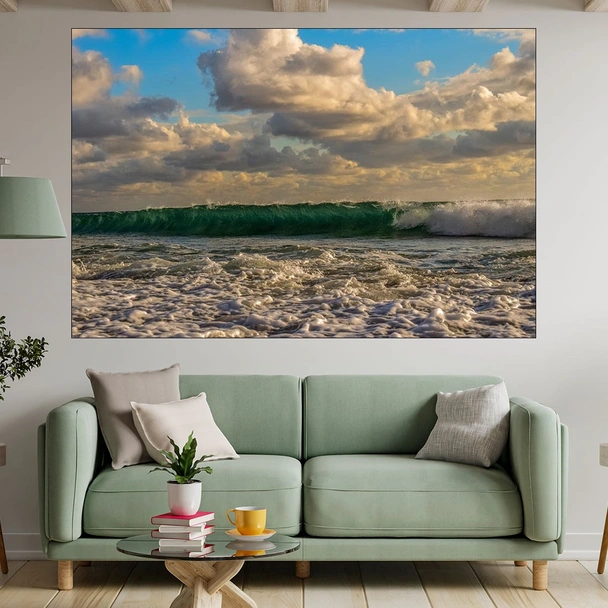 Декорация за стена (картина, пано) с мотив "Разбиваща се оеканска вълна - картина пано за стена". Изработена от олекотено PVC с дебелина 5 мм или канава от 100% памук, опъната върху дървена подрамка с дебелина 5 см. Изображението се печата с висококачествен UV печат, което е гаранция за запазване на цветовете с години!