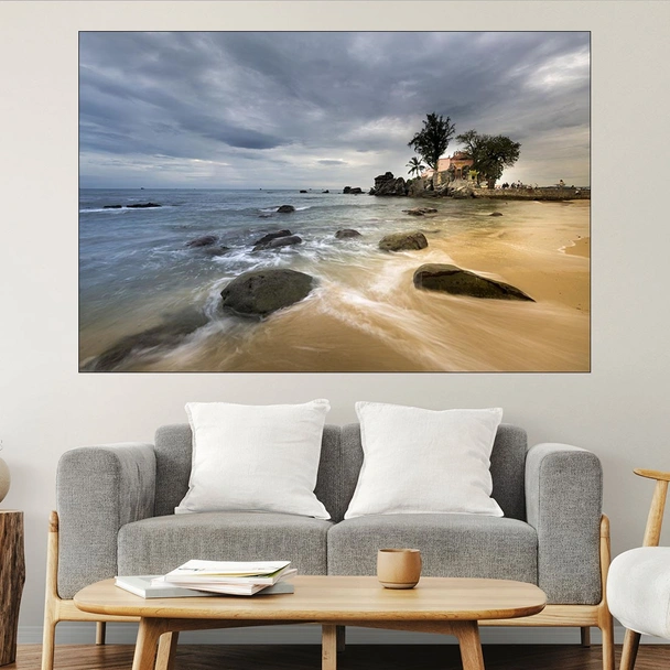 Декорация за стена (картина, пано) с мотив "Каменист плаж на остров Фукок - картина пано за стена". Изработена от олекотено PVC с дебелина 5 мм или канава от 100% памук, опъната върху дървена подрамка с дебелина 5 см. Изображението се печата с висококачествен UV печат, което е гаранция за запазване на цветовете с години!