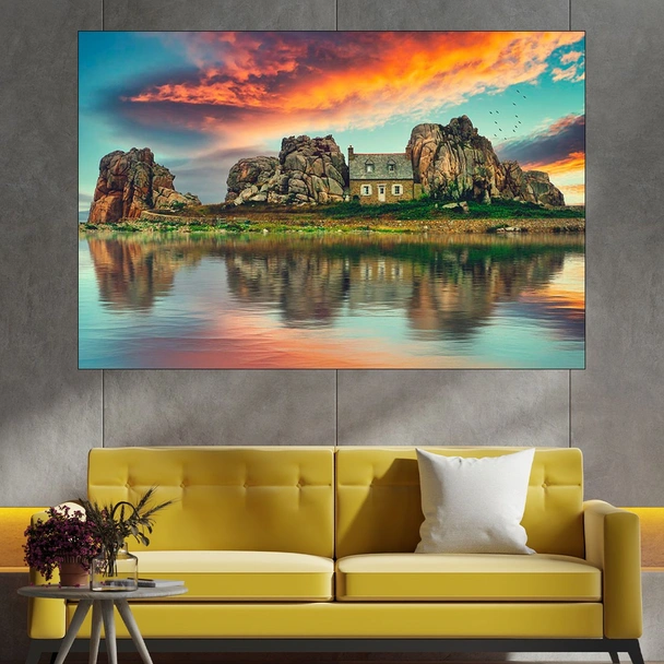 Декорация за стена (картина, пано) с мотив "Малка къща на скален остров - картина пано за стена". Изработена от олекотено PVC с дебелина 5 мм или канава от 100% памук, опъната върху дървена подрамка с дебелина 5 см. Изображението се печата с висококачествен UV печат, което е гаранция за запазване на цветовете с години!