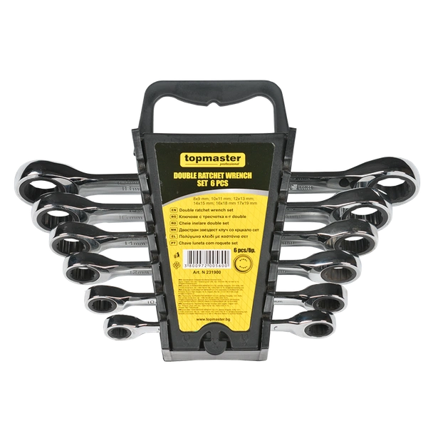 Комплект от 6 броя ключове с тресчотка Double Topmaster, изработени от хром-ванадиева (CR-V) стомана, придаваща голяма здравина, и с огледално полирано покритие.