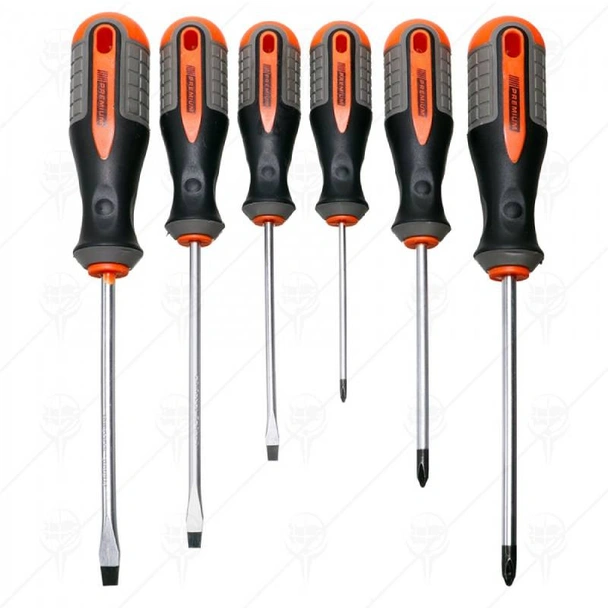 Комплект от 6 броя отвертки на фирма PREMIUM, изработени от висококачествена хром-ванадиева стомана. Отвертките разполагат с намагнетизиран връх и трикомпонентна дръжка, чиито дизайн допринася за по-голяма стабилност против превъртане върху гладки повърхности.