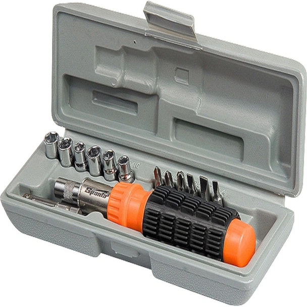 Реверсивната отвертка, с марката SPARTA е подходяща за монтаж и демонтаж на резбови съединения. Отвертката и битовете са направени от въглеродна стомана. Моделът се предлага в комплект от 14 части и с удобна пластмасова кутия за съхранение.
