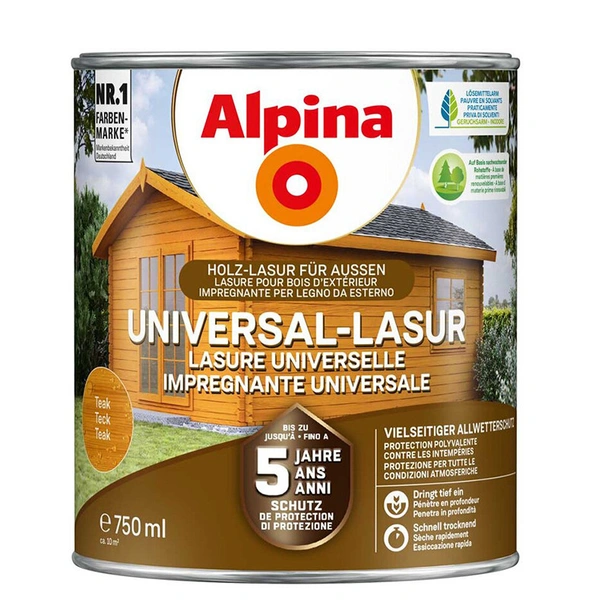 Устойчивият Alpina UNIVERSAL LASUR, подходящ за всякакъв вид дърво. Тъй като е с ниско съдържание на разтворители и без мирис, те позволяват приятно нанасяне. В допълнение, гланцовете са устойчиви на капене и пръски, което ги прави идеални за работа над главата. Благодарение на лесната обработка и бързосъхненето, можете да нанасяте до два слоя на ден.