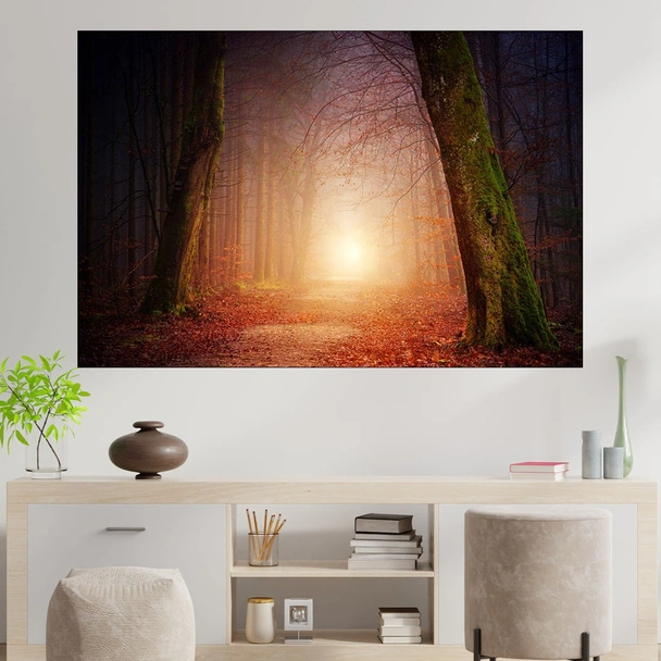 Декорация за стена (картина, пано) с мотив "Есенна пътека в мъглата - картина пано за стена". Изработена от олекотено PVC с дебелина 5 мм или канава от 100% памук, опъната върху дървена подрамка с дебелина 5 см. Изображението се печата с висококачествен UV печат, което е гаранция за запазване на цветовете с години!