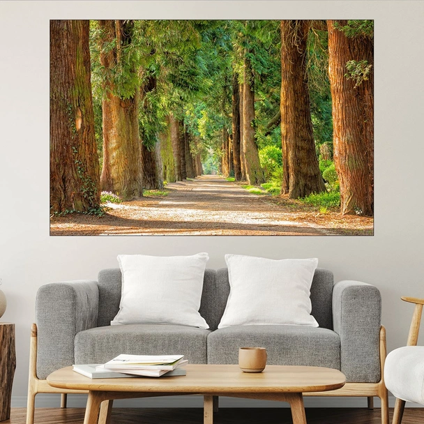 Декорация за стена (картина, пано) с мотив "Път сред вековни дървета - картина пано за стена". Изработена от олекотено PVC с дебелина 5 мм или канава от 100% памук, опъната върху дървена подрамка с дебелина 5 см. Изображението се печата с висококачествен UV печат, което е гаранция за запазване на цветовете с години!
