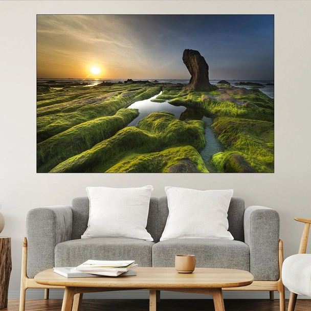 Декорация за стена (картина, пано) с мотив "Каменно крайбрежие - картина пано за стена". Изработена от олекотено PVC с дебелина 5 мм или канава от 100% памук, опъната върху дървена подрамка с дебелина 5 см. Изображението се печата с висококачествен UV печат, което е гаранция за запазване на цветовете с години!