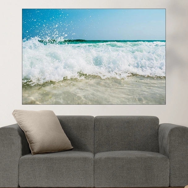 Декорация за стена (картина, пано) с мотив "Пяна от вълни - картина пано за стена". Изработена от олекотено PVC с дебелина 5 мм или канава от 100% памук, опъната върху дървена подрамка с дебелина 5 см. Изображението се печата с висококачествен UV печат, което е гаранция за запазване на цветовете с години!
