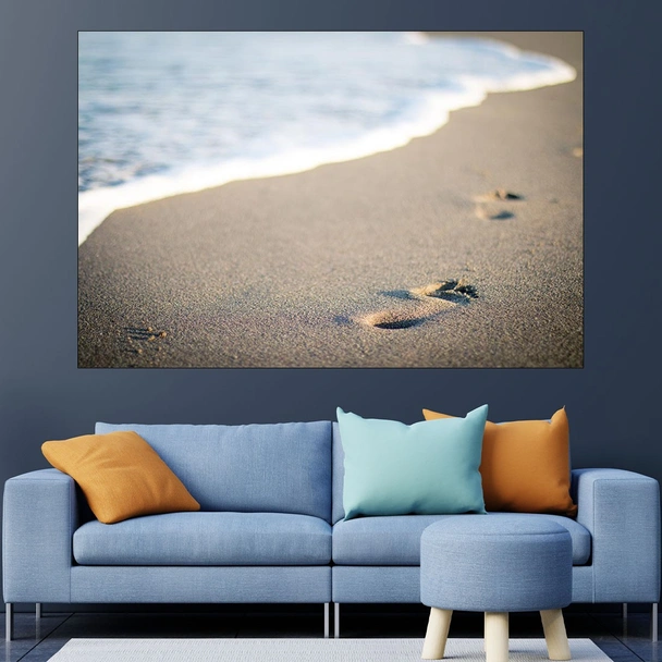 Декорация за стена (картина, пано) с мотив "Стъпки в пясъка - картина пано за стена". Изработена от олекотено PVC с дебелина 5 мм или канава от 100% памук, опъната върху дървена подрамка с дебелина 5 см. Изображението се печата с висококачествен UV печат, което е гаранция за запазване на цветовете с години!