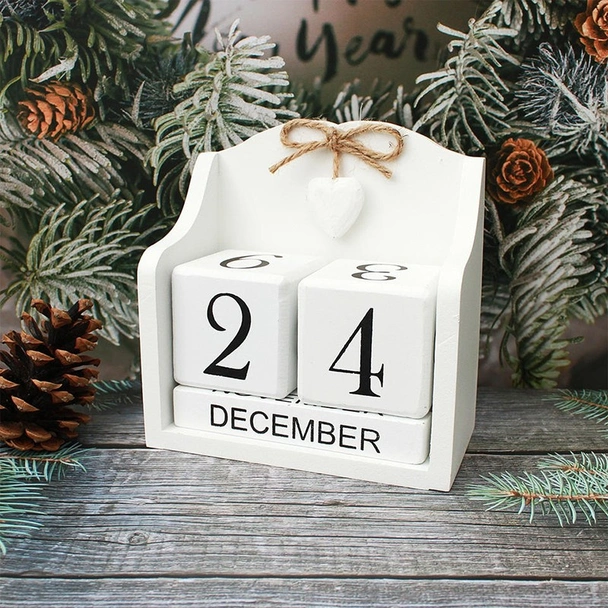 Дървен календар от кубчета в бял цвят и с декорация сърце с панделка.