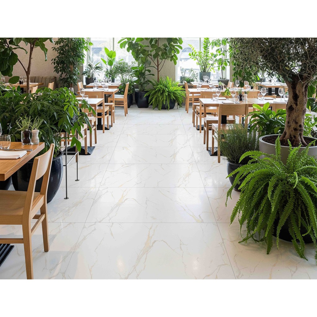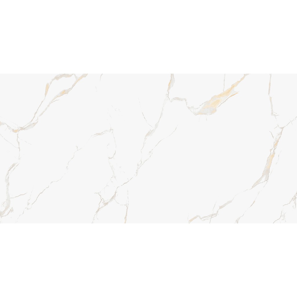 Този елегантен гранитогрес с мраморен дизайн в бял цвят със златисти нишки придава изискан и светъл облик на всяко пространство. Форматът 60x120 см е модерен избор за големи и малки помещения, тъй като създава усещане за простор и минимализъм. Плочките са ректифицирани, което позволява полагане с минимална фуга и постигане на изчистен, почти безшевен ефект. Гладката им повърхност комбинира стил и практичност, а класът против хлъзгане R9 осигурява допълнителна стабилност при ежедневна употреба.