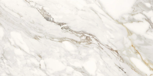 Големият формат на плочките позволява създаването на по-цялостни и визуално чисти повърхности с по-малко фуги. Това не само прави помещенията да изглеждат по-просторни, но и подчертава мраморния дизайн в цялата му красота. Цветовата комбинация от бяло и златисто се съчетава лесно с различни стилове на обзавеждане – от класически и луксозни интериори до съвременни и минималистични пространства, където се търси акцент с характер.
