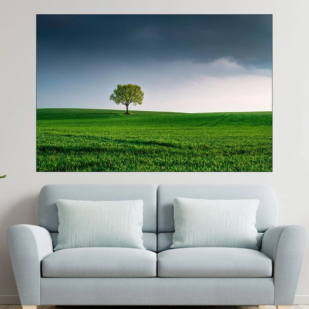Декорация за стена (картина, пано) с мотив "Дърво насред полето - картина пано за стена". Изработена от олекотено PVC с дебелина 5 мм или канава от 100% памук, опъната върху дървена подрамка с дебелина 5 см. Изображението се печата с висококачествен UV печат, което е гаранция за запазване на цветовете с години!