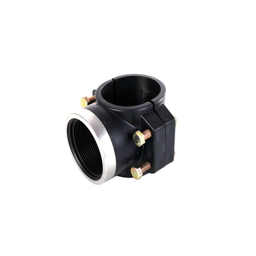 Конструкцията на скобата е здрава и устойчива, състояща се от две основни части, които се закрепват с четири болта. Болтовете са изработени от поцинкована или неръждаема стомана, осигурявайки устойчивост на корозия и дълготрайна стягаща сила. Усилващият пръстен около отклонението е изработен от неръждаема стомана, което заздравява резбовата връзка и предотвратява деформация при затягане на свързващия елемент. Полиетиленовите фитинги са подходящи за използване в системи за снабдяване с питейна вода, тъй като са нетоксични и химически устойчиви.
