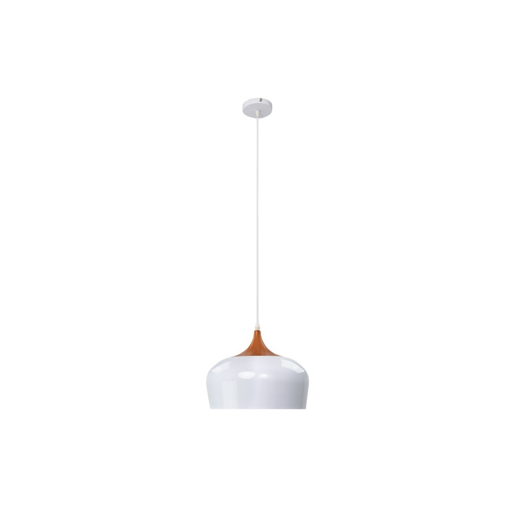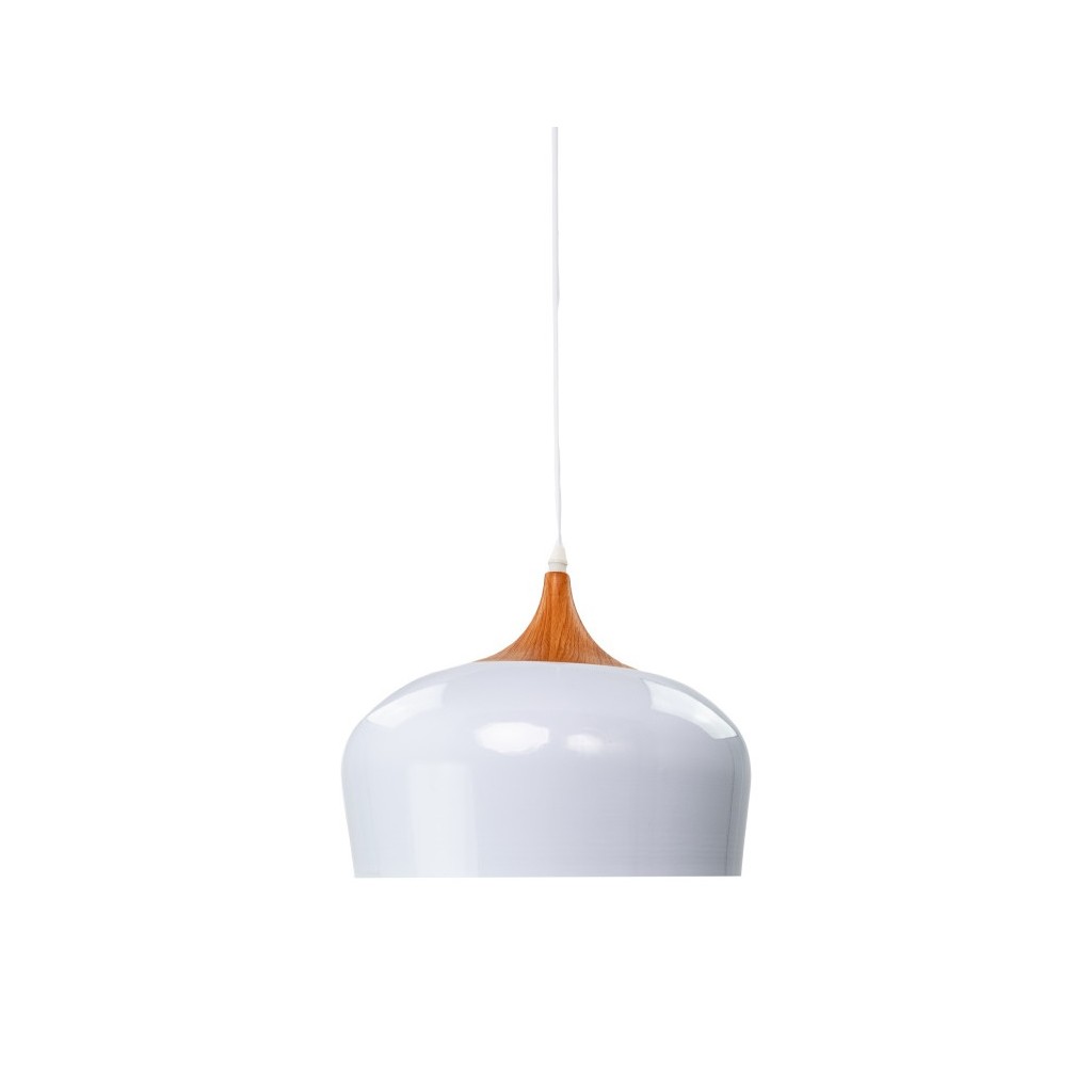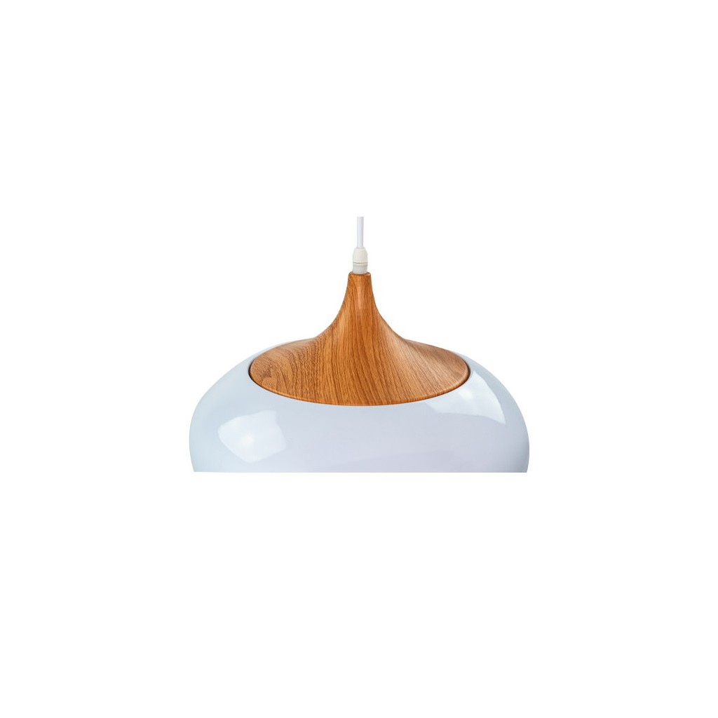Пенделът Белеза впечатлява с минималистичната си визия, подчертанa от матово бяло покритие и естествено дървено докосване в горната част на корпуса. Тази комбинация придава характер и топлина на осветлението, превръщайки го в акцентен елемент във всяко помещение. Стоманената конструкция с прахово боядисване гарантира устойчивост и дълъг живот на продукта, а отворената форма на разсейвателя осигурява приятна и равномерна светлина.